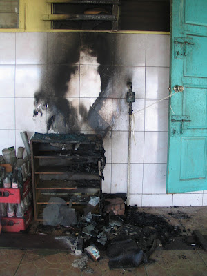 Even the owner of the stall where the fire started tried to be smile. I listened to their problems, the back of the shop was set fire at 12.20 am and luckily, a group of people who knew them alerted them before putting out the fire.